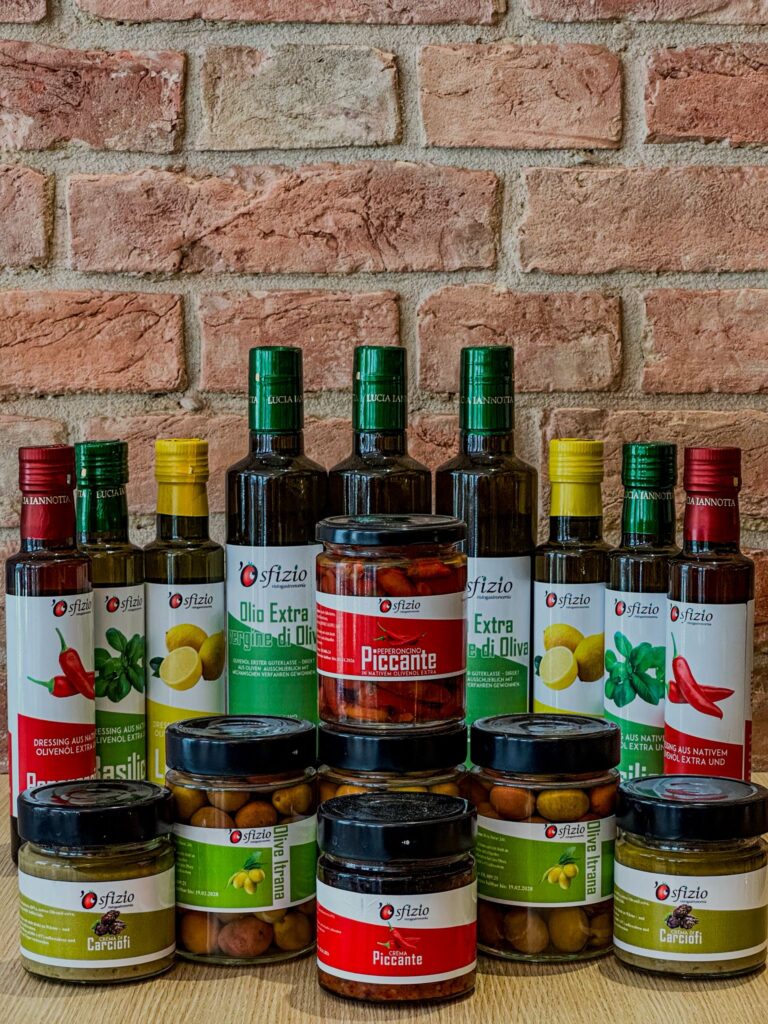 Im ´O Sfizio finden Sie u.a.: Natives Olivenöl extra, verschiedene aromatisierte Olivenöl-Sorten und Cremen.